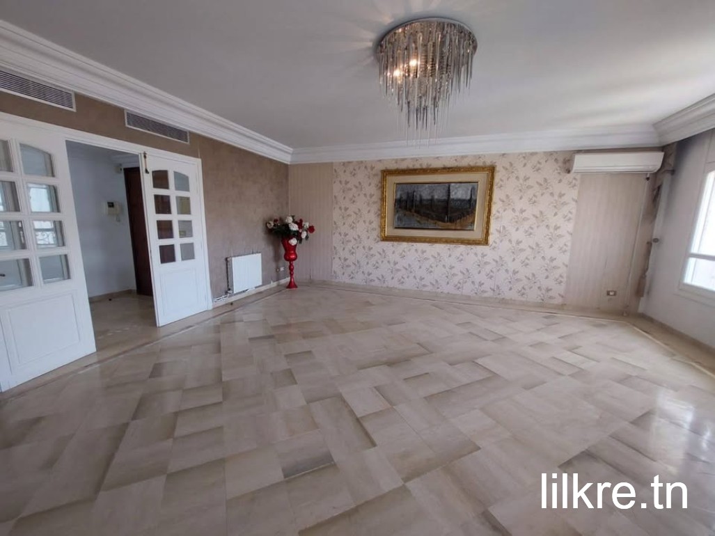 À Louer – Appartement S+3 à Ennasr 1 Situé au 5ᵉ étage d’une résidence bien entretenue et calme, proche de toutes les commodités. Description : Salon spacieux et lumineux avec balcon Cuisine fonctionnelle avec plusieurs rangements + séchoir Salle d’eau pour les invités 3 chambres à coucher avec placards Salle de bain commune Chauffage central Climatiseurs split system Place de parking au sous-sol inclus