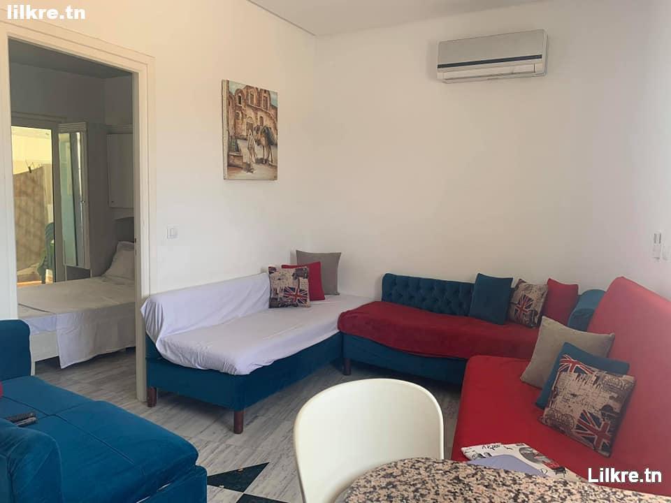 Joli appartement S+2 au rez-de-jardin, meublé, climatisé, avec Wi-Fi, situé dans un quartier résidentiel calme et sécurisé à Kheza...